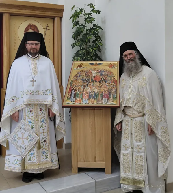 Unbestreitbarer Höhepunkt des Treffens war ganz gewiss die Segnung unserer Ikone Synaxis Heiliger der deutschen Lande, meisterhaft gestaltet und vollendet von Alexander Stoljarov, nach der Göttlichen Liturgie am Sonntag. Sie wurde mit Gesang und feierlichem, dreimaligem Rundgang um die Klosterkirche von zahlreichen Gläubigen geehrt. Nach Erstellung eines Ikonenrahmens und eines Analoj (inzwischen über die Tischlerei Zierenberg ausgeführt!) sowie nach Ausarbeitung eines singbaren Gottesdienstes soll die Ikone nunmehr bis zur 7. DOM-Jahres-Mitgliederversammlung (9. – 11. Mai) reisefertig gemacht werden. Die MV wird dann über die ersten Reisewege entscheiden. Ihren festen Standort wird die Ikone in der Verkündigungs-St.Justin-Einsiedelei haben (siehe Fotos). Lieferbare Reproduktionsvarianten sind in Arbeit.
